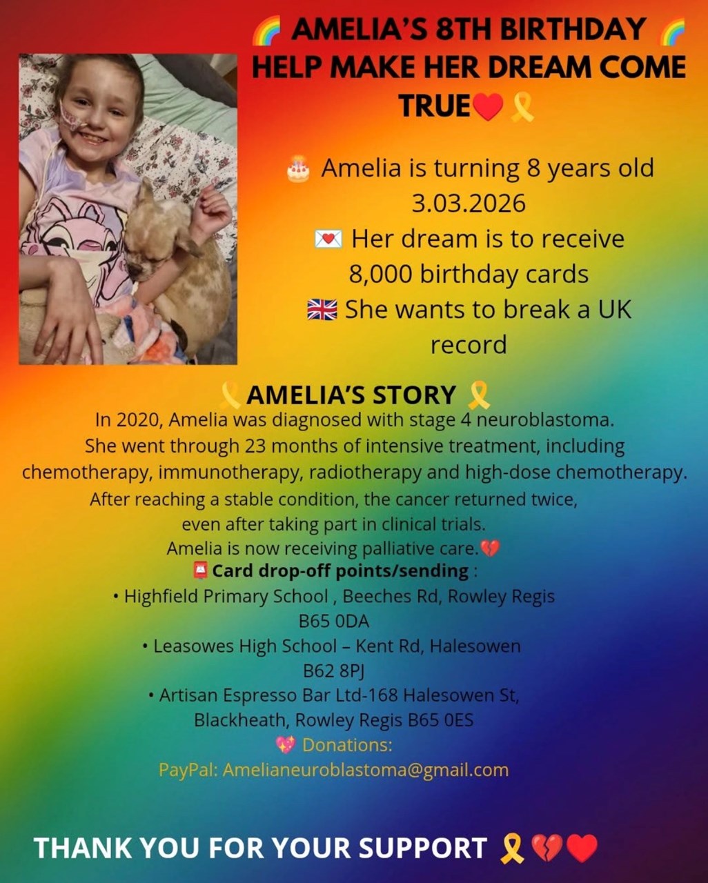 Amelia, a brave 7‑year‑old girl, has been fighting a long and gruelling battle with neuroblastoma since her diagnosis in 2020. Her current wish is to break the UK record for the most birthday cards received by one person before her 8th birthday in March.