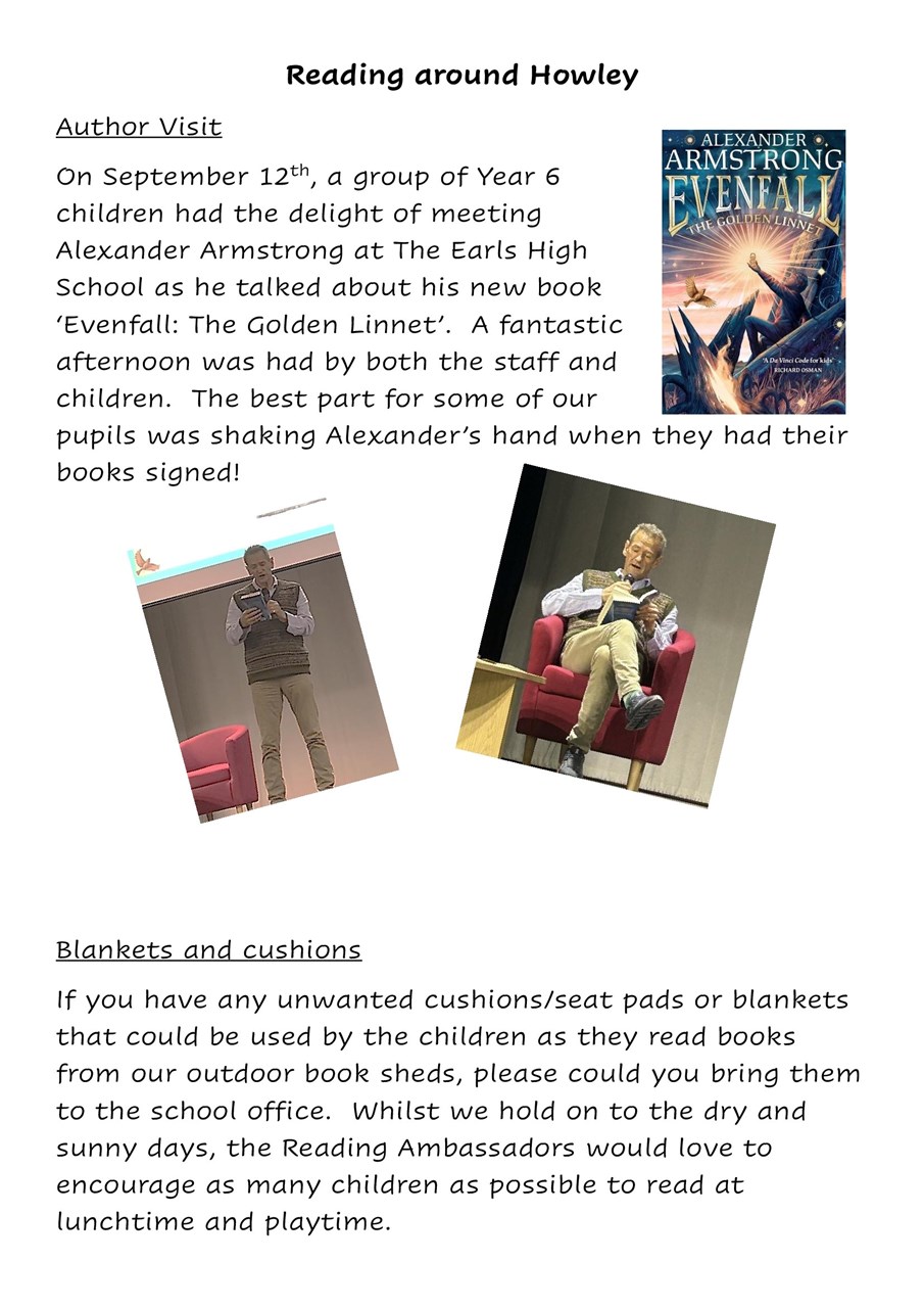 It has certainly been a busy start back with everyone working extremely hard. Not only have the children been learning lots of new things in their lessons, but we have also had additional events happening such as the author event at The Earls where some of our children met Alexander Armstrong and heard all about his new book. The Transport and Highway Services helped some of our Reception children learn about road safety through their ‘Teddy Takes a Walk’ workshop and Severn Trent have visited Year 4 to talk about how we can reduce our water usage.